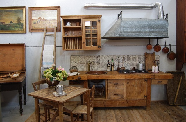Mit den Details spielen ist sehr wichtig. Zum Beispiel dürfen in einer Vintage Küche auf keinen Fall Gegenstände aus Kupfer fehlen, wie alte Töpfe oder auch Teller. Oder auch ein altes Porzellan Service. Und was halten Sie von dieser Keksdose aus Terracotta?