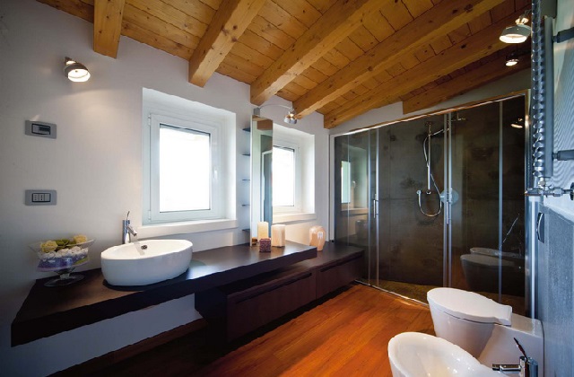 Die Dusche ist sehr gross und nutzt den ganzen Platz aus, der der Dachboden bietet. Auch hier wurden die Dachbalken angemessen behandelt und wasserdicht gemacht. Sie bleiben sichtbar im oberen Teil. Der Überzug der Wände ist aus Stein in Baumrinden Farbe. Diese passt sehr gut zu der Farbe des Parketts und der Balken. Aber vor allem auch mit dem Lavabo.