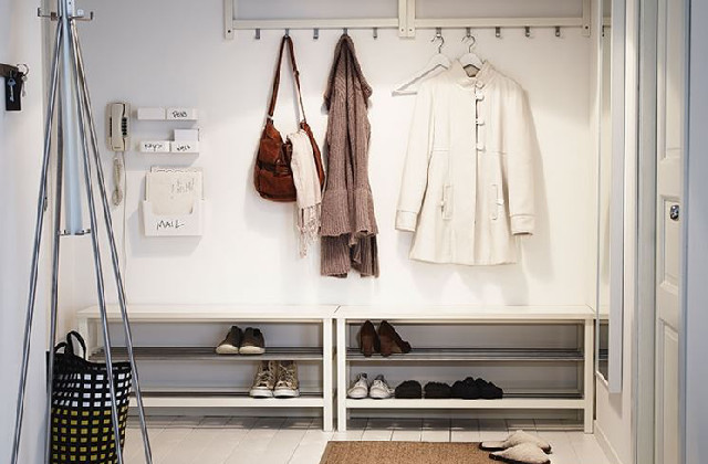 Beim Eingang wird es sicher eine freie Ecke geben, wo Sie einen Kleiderständer an die Wand hängen können und einen kleinen Schuhschrank darunter stellen können.