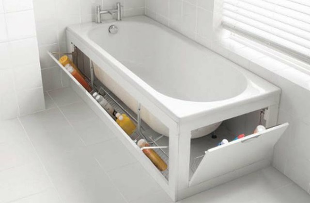 Das sperrigste Element im Bad ist sicherlich die Badewanne, weil es eine Art Wand bildet, die nicht verwendet werden kann. Hingegen können wir daran denken, den Platz der unter der Wanne ist, zu verwenden. In dem wir kleine Schränke an Stelle der Plättchen anbringen, damit wir genügend Platz haben, um ganz viel zu verstauen, wie auch Kinderspielsachen.