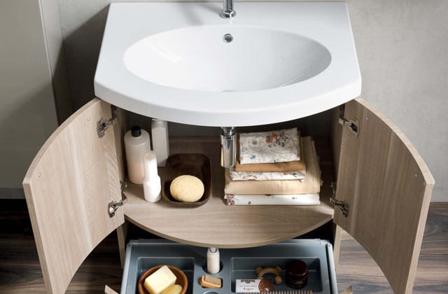 Falls wir schon ein Möbelstück haben und das Waschbecken darin befestigt ist, können wir den Platz der Schranktürchen verwenden und einen kleinen Behälter anzubringen, um den Föhn oder die Bürste darin aufzubewahren, ohne den Schrank noch mehr voll zu stopfen.