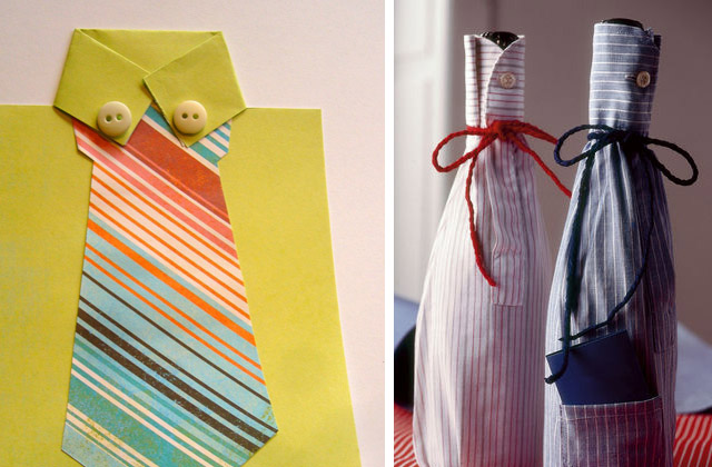 Und wie wäre es mit einer guten Flasche Wein. Nehmen Sie ein altes Hemd und schneiden Sie den Ärmel ab, nähen Sie das Ende zusammen und schieben Sie die Flasche hinein. Die Manschettenknöpfe werden den Flaschenhals festhalten und wenn Sie möchten, können Sie noch eine Schleife umbinden.