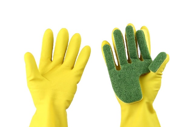 Der linke Handschuh ist aus Gummi wie jeder andere Handschuh, der rechte hingegen hat auf der Handfläche und auf den Fingern einen Schwamm befestigt. Damit das Abwaschen einfacher wird.
