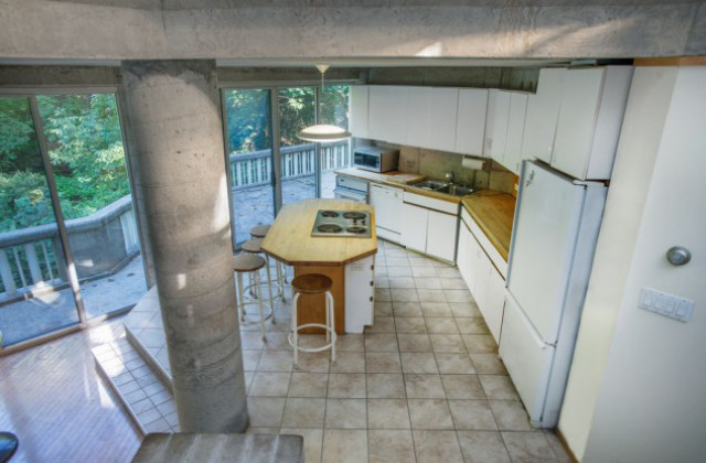 Das Wohnzimmer, die Küche und der Esssaal schauen alle auf die gleiche Seite des Hauses, die auf einen grünen Wald blickt. Diese Räume sind dank den Glaswänden lichtdurchflutet.