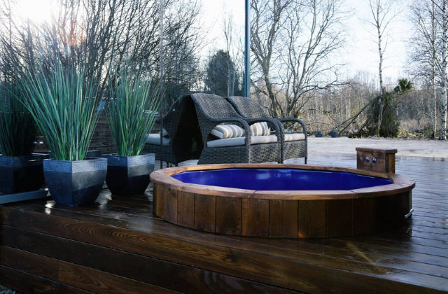 Außenrum gibt es einen Holzgehweg, es gibt auch genügend Platz für einen Pool, ganz für die Entspannung der Bewohner.