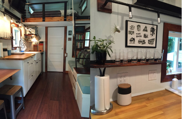 Die Struktur des Tiny Houses ist auf vier Rädern und ganz aus Holz. Vieles davon ist wiederverwendetes Material. Auf jeder Seite gibt es Fenster, damit es drinnen auch richtig hell wird und das Licht den Raum größer wirken lässt.