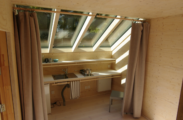 Da es sich um ein eher kleines Zimmer handelt, sollte man alles tun, damit mindestens ein Bett und ein Schrank darin Platz haben. Das Badezimmer kann unter dem Dach des Minihauses gebaut werden.