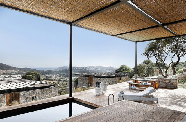 Das Haus verfügt über eine Terrasse und einen Pool, die mit Bambus überzogen wurden, der durch seine Farbe und Konsistenz sehr gut mit der Inneren Wand aus Stein harmonisiert, die man durch die Glasschiebetür hindurch sehen kann.