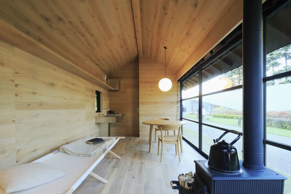 Die tragende Struktur des Mini Hauses Muji ist komplett aus Zedernholz und auch der Boden besteht aus dem selben Material. Die goldenen Reflexe und das helle Holz sind perfekt für so einen kleinen Raum und lassen ihn größer wirken. Dabei hilft auch die innere Beleuchtung und die grossen Fenstern.