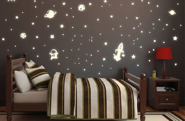 Es gibt dann auch einige sehr witzige Lösungen, damit das Zimmer noch fröhlicher und lebendiger wirkt. Wie den alt bewerteten “Sternenhimmel”. Im Handel gibt es Aufklebern, die im dunkeln leuchten, in Form von Sternen oder Planeten, die auf der Decke oder die Wände geklebt werden können.