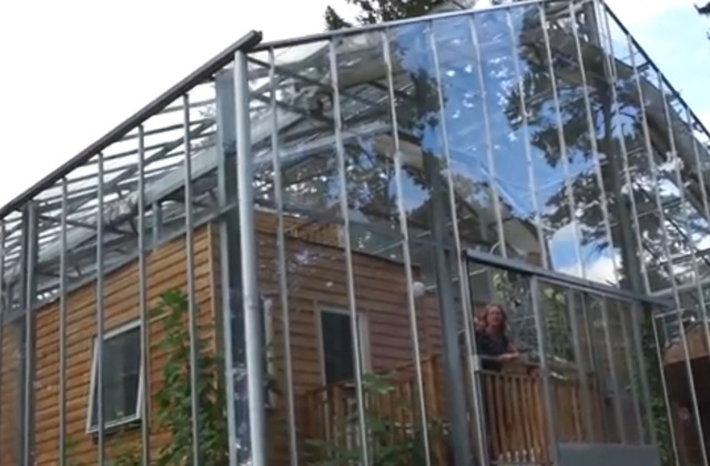 Nichts anderes heizt das Haus, nur diese große Struktur, die das Haus von der Kälte schützt. Nach dem Prinzip der Gewächshäuser, ist auch hier das Einspeichern von Regenwasser vorhergesehen, das sich auf den Glasscheiben ablagert und das für das ganze Haus verwendet wird.