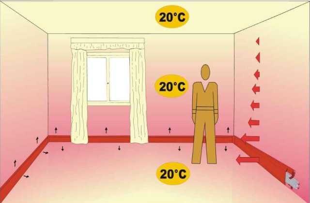 Die Wärme, die von der Fussleiste ausgestossen wird, geht bis zur Decke, dadurch wird auch der Bildung von Schimmel vorgebeugt und der Raum hat weniger Feuchtigkeit. Man erhält eine angenehme Wärme vom Boden bis zur Decke.